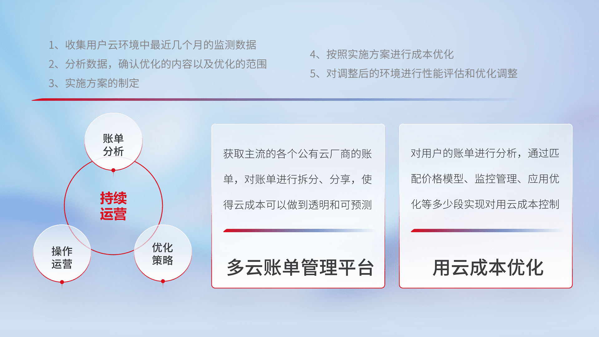 通过多云纳管,,,以统一的资源数据模型把客户的云资源进行抽象和封装,,,,进而实现对多云资源的统一操作,,保障云资源管理的可靠性、、、、稳定性与可用性。。量身定制化运维内容,,配置、、开发运维、、、补丁管理、、、、备份、、、监控、、、认证和访问管理、、、、审计和日常巡检等,,,,保障在用云过程中的可靠度,,稳定度以及高可用率。。。。