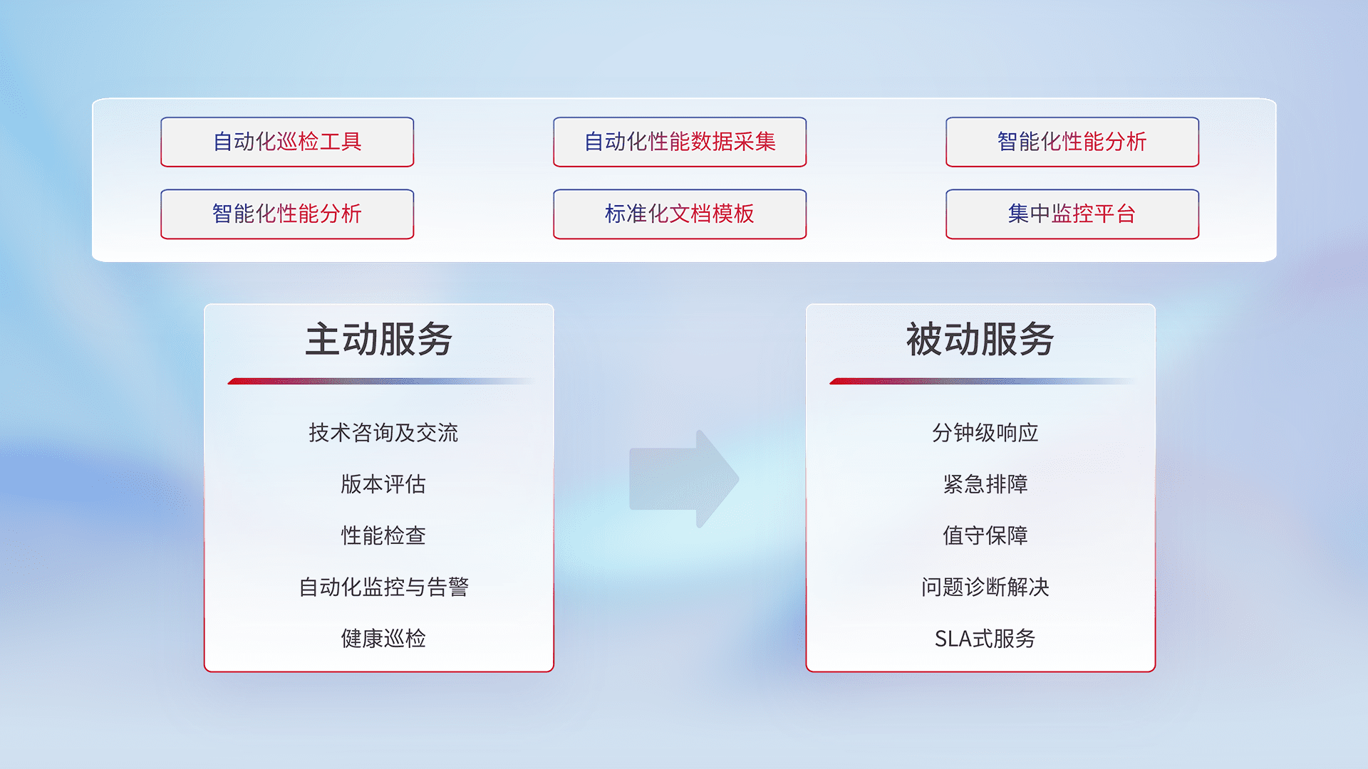 智能化工具和标准化文档,,,保障服务质量,,提供主动服务(包含技术咨询、、、、版本评估、、性能检查、、自动化监控与告警、、健康巡检)和被动服务包含(分钟级响应、、紧急排障、、、值守保障、、、、问题诊断解决、、、SLA服务)。。